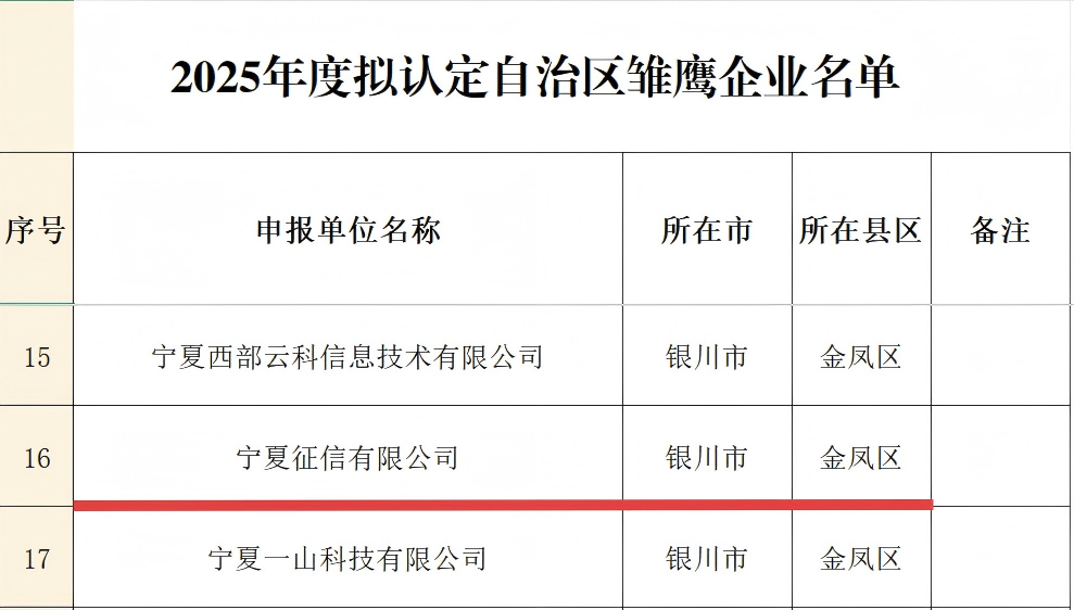 近日,自治區(qū)科學(xué)技術(shù)廳公布2025年度自治區(qū)高成長(zhǎng)創(chuàng)新型企業(yè)和創(chuàng)新型標(biāo)桿企業(yè)認(rèn)定名單。憑借突出的技術(shù)研發(fā)能力和產(chǎn)品創(chuàng)新能力,寧夏國(guó)投集團(tuán)子企業(yè)寧夏征信有限公司榮獲“自治區(qū)雛鷹企業(yè)”稱號(hào)。