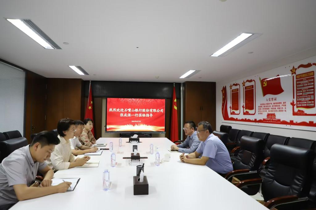 8月12日下午,石嘴山銀行股份有限公司黨委書記、董事長張成保一行到寧夏金資公司座談交流。寧夏金資公司黨委書記、董事長馮江波參加座談交流會議。