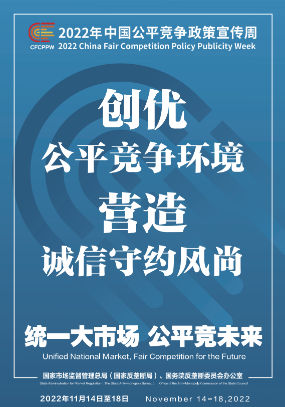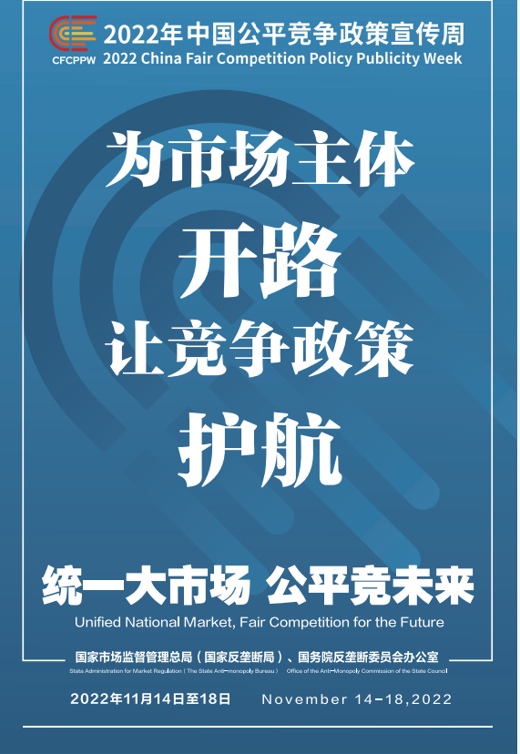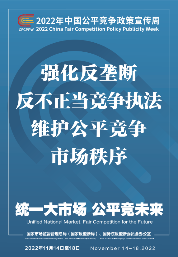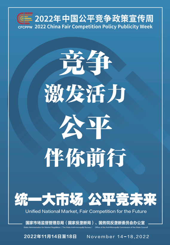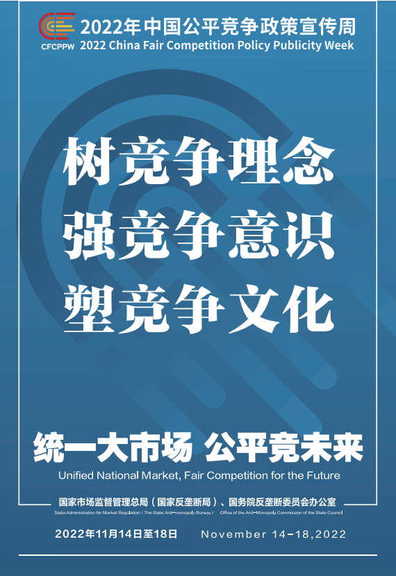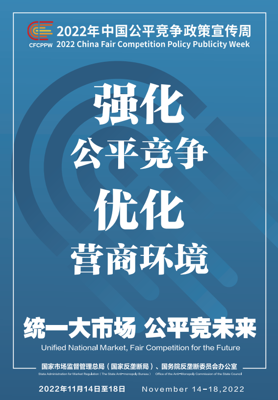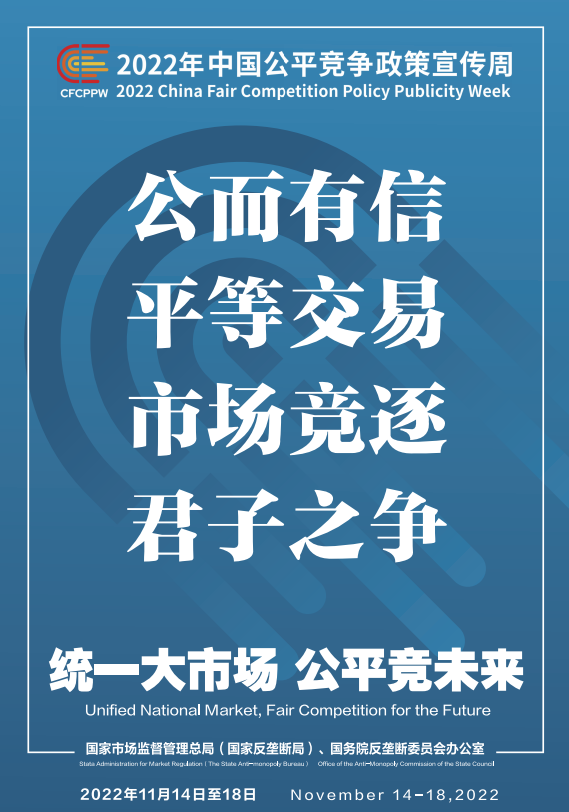 公平競爭是市場經(jīng)濟(jì)的內(nèi)在要求。為深入學(xué)習(xí)貫徹黨的二十大精神,落實黨中央、國務(wù)院決策部署,國家市場監(jiān)督管理總局(國家反壟斷局)、國務(wù)院反壟斷委員會辦公室會同有關(guān)部門和單位定于2022年11月14日至18日共同開展首屆中國公平競爭政策宣傳周活動,大力培育和弘揚公平競爭文化,營造有利于公平競爭的良好環(huán)境,促進(jìn)全國統(tǒng)一大市場建設(shè),推動高質(zhì)量發(fā)展。