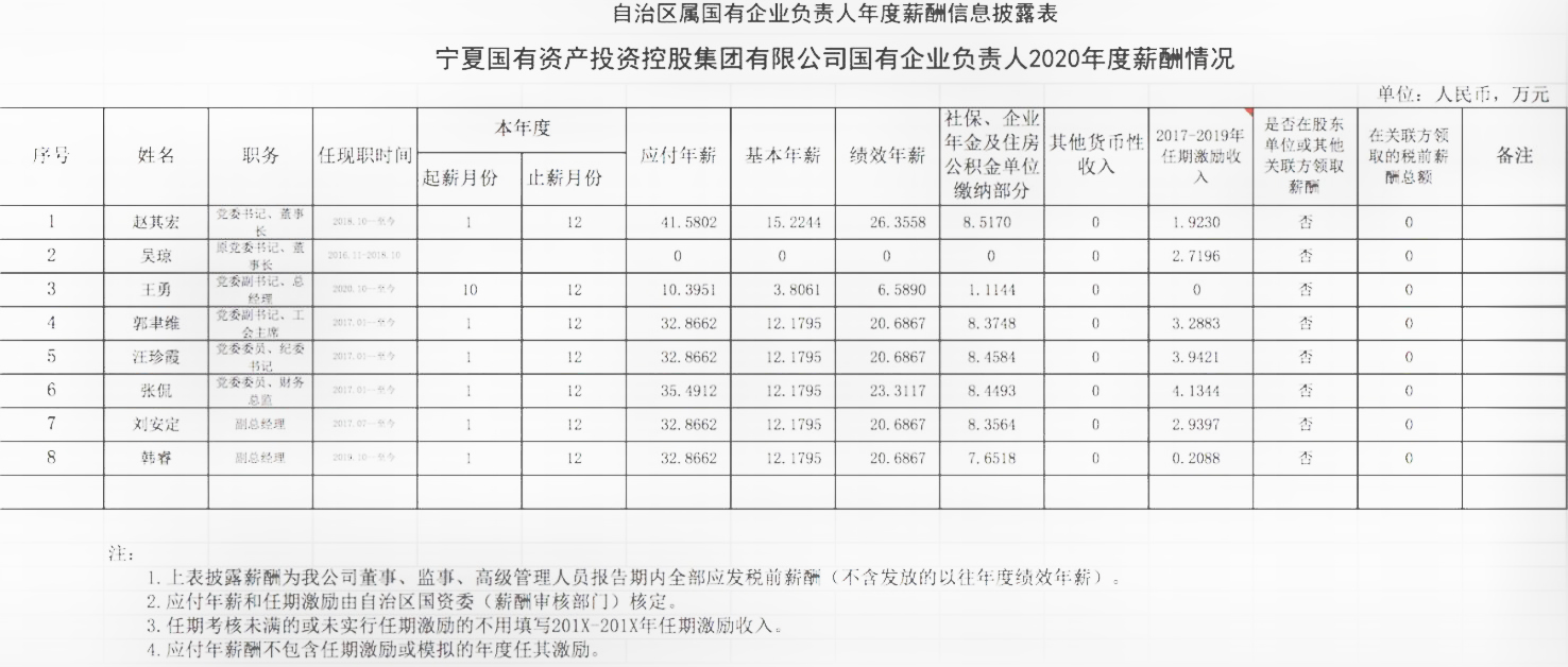 寧夏國投集團(tuán)企業(yè)負(fù)責(zé)人2020年度薪酬情況