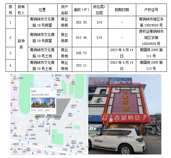 該戶債權抵押物原為吉龍賓館,總抵押面積1635.37平米。抵押物位于青銅峽市中心地段影劇院廣場,四周有青銅峽賓館、新華百貨、寧夏銀行、文化館等地標建筑,距青銅峽市政府、步行街2千米左右。周邊生活配套完善,商業(yè)氛圍及生活氣息濃厚,交通便利,地理位置優(yōu)越,適合經營酒店賓館等,運營和增值能力較強,具備良好商業(yè)價值和現金回收水平。該債權已訴訟執(zhí)行,無司法障礙。