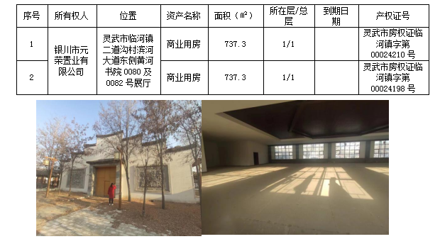 該戶債權(quán)抵押物位于靈武市臨河鎮(zhèn)濱河大道東側(cè)黃河書院內(nèi)0080號和0082號展廳,面積共計1474.6平方米。抵押物房屋戶型良好,寬敞明亮,有部分基礎(chǔ)裝修。該地理位置交通便利,距離銀川河東國際機場約3公里。黃河書院集“文化傳播、學習靜修”為一體,環(huán)境優(yōu)美宜人,遠離鬧市喧囂,適合經(jīng)營飯店、旅游展廳等。