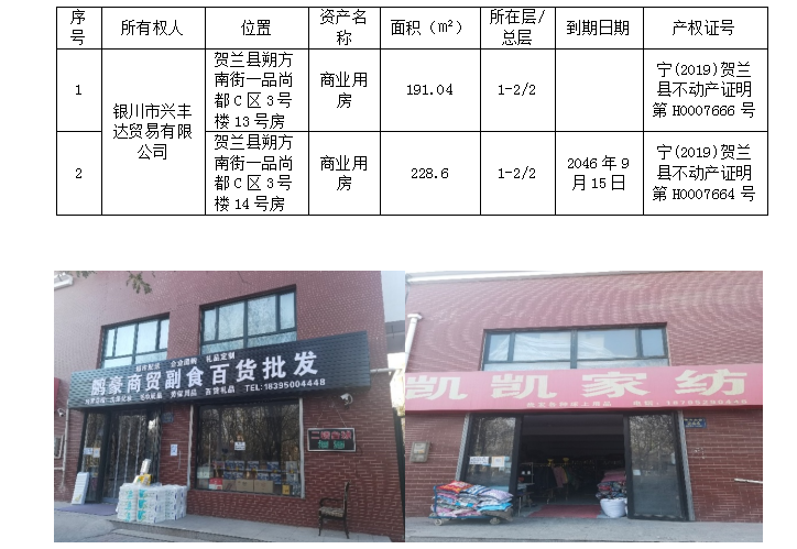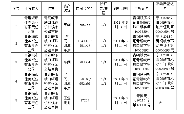 該戶債權(quán)項(xiàng)下位于賀蘭縣朔方南街一品尚都的抵押物,周圍商業(yè)氛圍較好,目前兩套房產(chǎn)均有承租人;青銅峽市峽口鎮(zhèn)談橋村的土地和車間位于青銅峽市峽口鎮(zhèn)譚橋村侯余公路南側(cè),即青銅峽市佳美紙業(yè)有限責(zé)任公司廠區(qū),目前因債務(wù)人資金短缺,暫時處于停產(chǎn)、關(guān)閉狀態(tài)。