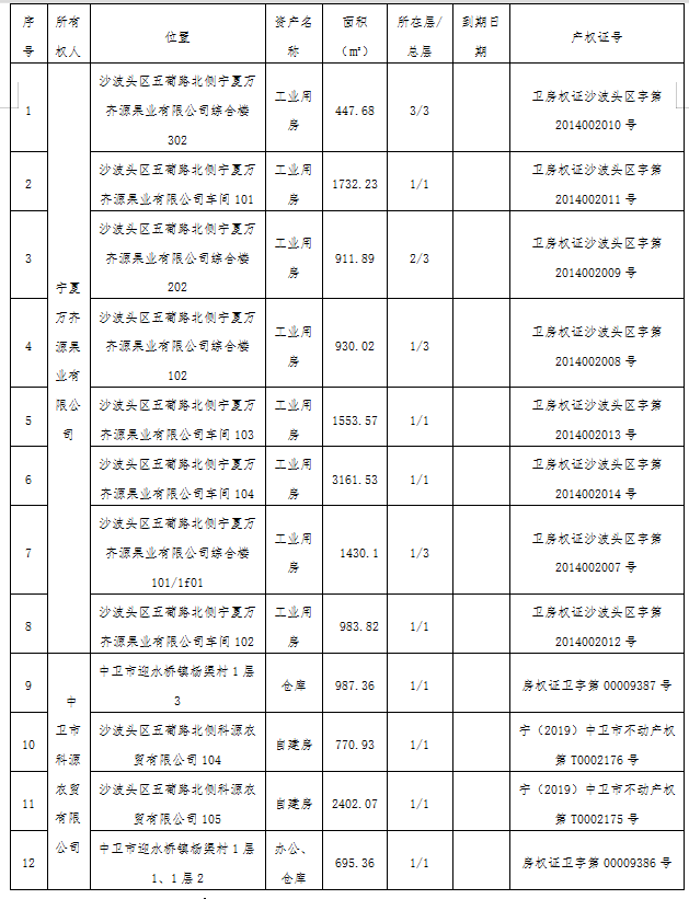債務(wù)企業(yè)為中衛(wèi)市明星企業(yè),企業(yè)產(chǎn)業(yè)鏈完整,暫時因資金鏈斷裂造成停產(chǎn),債權(quán)抵押物位于沙波頭區(qū)五葡路北側(cè),為新建辦公樓、廠房及冷庫,設(shè)施齊備。抵押物地處中衛(wèi)市區(qū)邊緣,交通便利,目前,部分廠房處于租賃狀態(tài),有較高的實用價值。