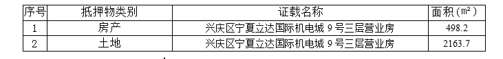 抵押物為興慶區(qū)寧夏立達(dá)國際機(jī)電城9號營業(yè)房第3層整層,面積共計2363.44㎡,具體如下: