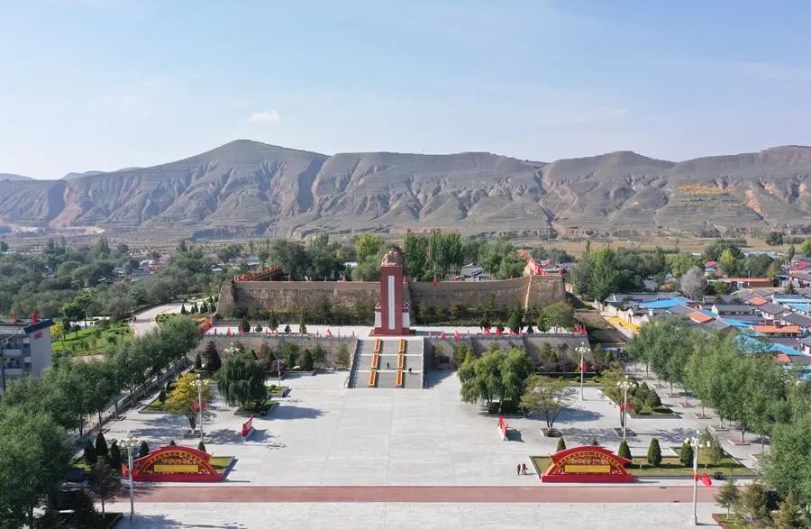 這是位于寧夏固原市西吉縣的將臺堡紅軍長征會師紀(jì)念園(2021年10月18日攝,無人機(jī)照片)。新華社記者 盧鷹 攝