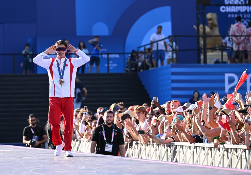 ??巴黎奧運(yùn)會(huì)跳水男子雙人三米板金牌得主、中國選手龍道一在法國巴黎冠軍公園與觀眾互動(dòng)(2024年8月5日攝)。新華社記者 賀燦鈴 攝