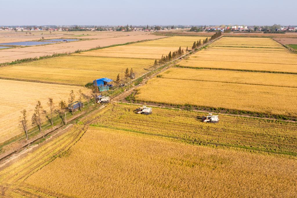 ??在湖南省岳陽市華容縣團(tuán)洲垸,村民駕駛收割機(jī)收獲水稻(2024年11月1日攝,無人機(jī)照片)。新華社記者 陳思汗 攝